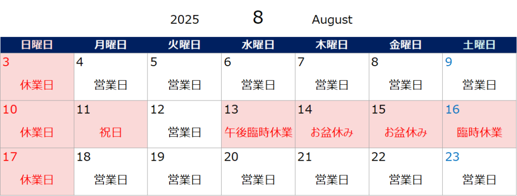 さて、弊社ではお盆期間に関しまして下記の通り休業いたしますので、ご案内申し上げます。